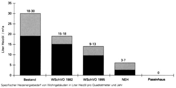 Die novellierte Wärmeschutzverordnung von 1995 ( entspricht dem Niveau des „Schwedenstandards“ von 1980 ) begrenzt den Heizenergiebedarf für Neubauten auf Werte zwischen 9 und 13 Liter Heizöl je Quadratmeter und Jahr.