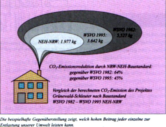 Rechenbeispiel: In einem herkömmlichen Einfamilienhaus benötigt man 10 l/(m² und Jahr). Im Niedrigenergiehaus spart man 3 l/(m² und Jahr). Dies entspricht bei einem Ölpreis von 90 Pf/ l gemittelt über die Nutzungsdauer von 30 Jahren einer Ersparnis von ca. 3 DM pro Quadratmeter Wohnfläche.