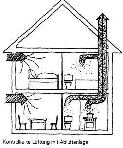 Aus den Räumen mit dem größten Problemstoffanfall (Bad, WC, Küche) wird über einen Lüfter verbrauchte Luft abgesaugt und über Dach abgeführt.