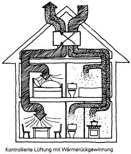 1.1.3.4.2 Systeme mit Wärmerückgewinnung:Verbrauchte Luft wird aus Bad, WC und Küche abgesaugt, durch einen Wärmetauscher geleitet (wobei die Abluft einen großen Teil ihrer Energie an von außen angesaugte Frischluft abgibt) und dann meist über das Dach abgeleitet.