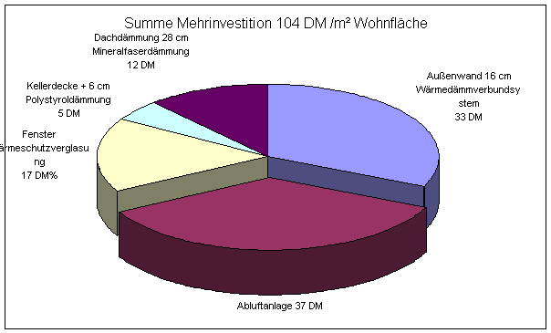 Aus Erfahrung, die man mit bereits fertiggestellten Niedrigenergiehäusern hat, kann man sagen, daß die baulichen Mehrkosten bei einem Einfamilienhaus unter 10.000 DM liegen.