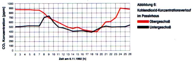 Durch die Lüftungsanlage werden Schad- und Geruchsstoffe kontinuierlich abgeführt. Die Wirksamkeit der Lüftung wurde anhand der Kohlendioxid Konzentration gemessen. Kohlendioxid ist, weil es vom Menschen ausgeatmet wird, ein gutes Maß für die Geruchsbelästigung in einem Raum. Auch subjektiv wird die Belüftung von den Bewohnern wahrgenommen: “Es riecht nicht im Schlafzimmer, wenn wir morgens aus dem Bad zurückkommen.