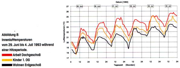 Der Temperaturverlauf wurde vom 29.06- 04.07 aufgezeichnet, bei Außentemperaturen bis 32°C. Im Haus lag der Spitzenwert bei 26°C, er wurde am 04.07. für eine halbe Stunde im Dachgeschoss erreicht.