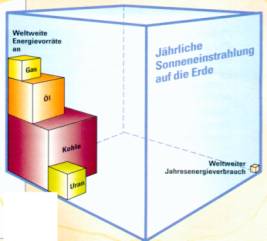 Alle zwanzig Minuten bringt die Sonne soviel Energie auf die Erdoberfläche, wie die gesamte Menschheit in einem Jahr verbraucht. Selbst auf die Fläche des vermeintlich sonnenarmen Deutschland kommt jährlich 135mal mehr Sonnenenergie an, als wir verbrauchen. Wäre die Sonne mit einem 12 Meter dicken Eispanzer umgeben, hätte sie ihn in weniger als einer Sekunde weggeschmolzen.
