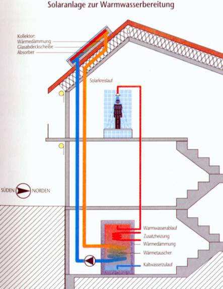 Macht man eine Reise in südliche Länder wie Zypern oder Israel, so fallen einem auf vielen Dächern schwarze Behälter auf. Die Menschen nutzen so die Sonnenenergie zur Erwärmung ihres Brauchwassers. Die Sonne ist ein Wärmespender. So wird Wasser in einem Gartenschlauch, der in der Sonne liegt, erwärmt, und zwar in einem schwarzen Schlauch stärker als in einem hellen. Dieses Grundprinzip wird in der Solartechnik zur direkten Erzeugung von Wärme genutzt. Dabei wird an Stelle des Gartenschlauches eine schwarz gefärbte Empfangsfläche benutzt, die die Sonnenenergie absorbiert und in Wärme umwandelt. Dieser sogenannte Absorber wird von einem Wärmeträger, z.B. Wasser oder Luft, durchströmt, mit dem die Wärme abtransportiert wird. Absorber gibt es in den unterschiedlichsten Bauformen und Materialien. Um die ausbeute an nutzbarer Sonnenenergie zu erhöhen, macht man sich den Treibhauseffekt in Kombination mit einer guten Wärmedämmung zunutze und baut den Absorber in einen gut wärmegedämmten Kasten mit Glasabdeckung ein.