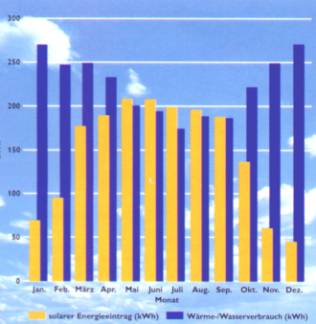Warmes Wasser benötigt jeder im Haushalt ganzjährig. Es stimmen für die Warmwasserbereitung Sonnenenergieangebot und Wärmebedarf zu bestimmten Jahreszeiten überein.