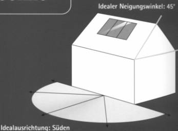 Den größten Ertrag bringen die Kollektoren, wenn sie in Richtung Süden in einer Neigung zwischen 40° und 50° installiert werden. Stehen sie flacher bzw. steiler oder sind sie nach Südwest oder Südost ausgerichtet, reduziert sich die Energieausbeute nur geringfügig. Selbst bei einer Ausrichtung der Kollektoren nach Westen oder Osten werden immer noch etwa 80% des maximal möglichen Energieertrags erreicht. Es findet sich also immer eine geeignete Fläche für Kollektoren.