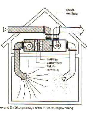 Es handelt sich hierbei um zentral aufgestellte Be- und Entlüftungsgeräte mit angeschlossenem Luftkanalsystem sowie Zu- und Abluftöffnungen n den einzelnen Räumen. Mit diesen Anlagen ist eine vorbestimmte Luftführung und Dosierung der Luftmenge möglich. Durch die Aufstellung der Zentralgeräte außerhalb der Wohnräume und durch die Möglichkeit des Einbaus zusätzlicher Schalldämpfer, ist mit Geräuschproblemen nicht zu rechnen. Diese Anlagen haben allerdings keine Einrichtung zur Wärmerückgewinnung. Die den Räumen zugeführte Außenluft muß vorher auf Raumtemperatur erwärmt werden. Hierfür wird Energie verbraucht.