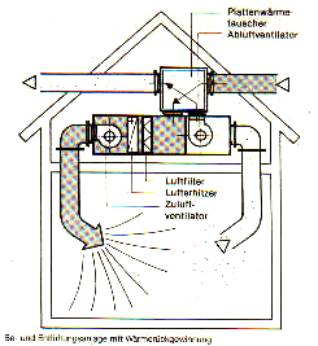 In den vergangenen Jahren konnte der bauliche Wärmeschutz vieler Wohngebäude wesentlich verbessert werden. Es wurden vor allem neue wärmedämmende Fenster eingebaut und der Wärmeschutz der Außenwände verbessert. Die durch die Hülle eines Gebäudes nach außen verlorengehende Wärmemenge (Transmissions-Wärmeverlust) reduziert sich dadurch erheblich. Kaum verringert werden konnte hingegen bisher die Wärmemenge, die aufgrund der erforderlichen Lufterneuerung innerhalb eines Gebäudes verlorengeht (Lüftungswärmeverlust). Dadurch erhöht sich zwangsläufig der Anteil des Lüftungswärmeverlustes am Gesamtwärmeverlust (= Transmissionswärmeverlust + Lüftungswärmeverlust). Daran können auch dichtschließende Fenster nichts ändern. Um nämlich den erforderlichen Luftaustausch in den einzelnen Räumen zu gewährleisten, muß häufiger als früher gelüftet werden. Und gerade dies führt oft zum Dauerlüften und somit zur Energieverschwendung. Falsch verstandenes Energiesparen, insbesondere wenn zu wenig gelüftet und zu wenig geheizt wird, kann dagegen zu Bauschäden oder zu gesundheitlichen Beeinträchtigungen der Bewohner führen. Eine weitere Reduzierung des Transmissionswärmeverlustes bei gut wärmegedämmten Häusern wird in Zukunft nur noch bedingt möglich sein. Um dennoch eine Verringerung des Gesamtwärmeverlustes eines Gebäudes zu erreichen, müssen künftig verstärkt Maßnahmen zur Verringerung des Lüftungswärmeverlustes durchgeführt werden. Dies bedeutet für alle Beteiligten (Planer, Handwerker, Verbraucher) ein Umdenken. Kontrollierte (mechanische) Be- und Entlüftungsanlagen werden in Zukunft verstärkt an Bedeutung gewinnen. Darüber hinaus ermöglichen Einrichtungen zur Wärmerückgewinnung eine weitere Reduzierung der Lüftungswärmeverluste. Das Öffnen der Fenster wird auch bei kontrollierter Wohnungslüftung selbstverständlich auch weiterhin möglich sein. Doch der Nutzer wird es an seinem eigenen Geldbeutel merken, daß die Effektivität der Wärmerückgewinnungsanlage sinkt, wenn er zusätzlich unkontrollierte Luftführung zuläßt. Denn dadurch wird ein Teil der möglichen Energieeinsparung verschenkt.